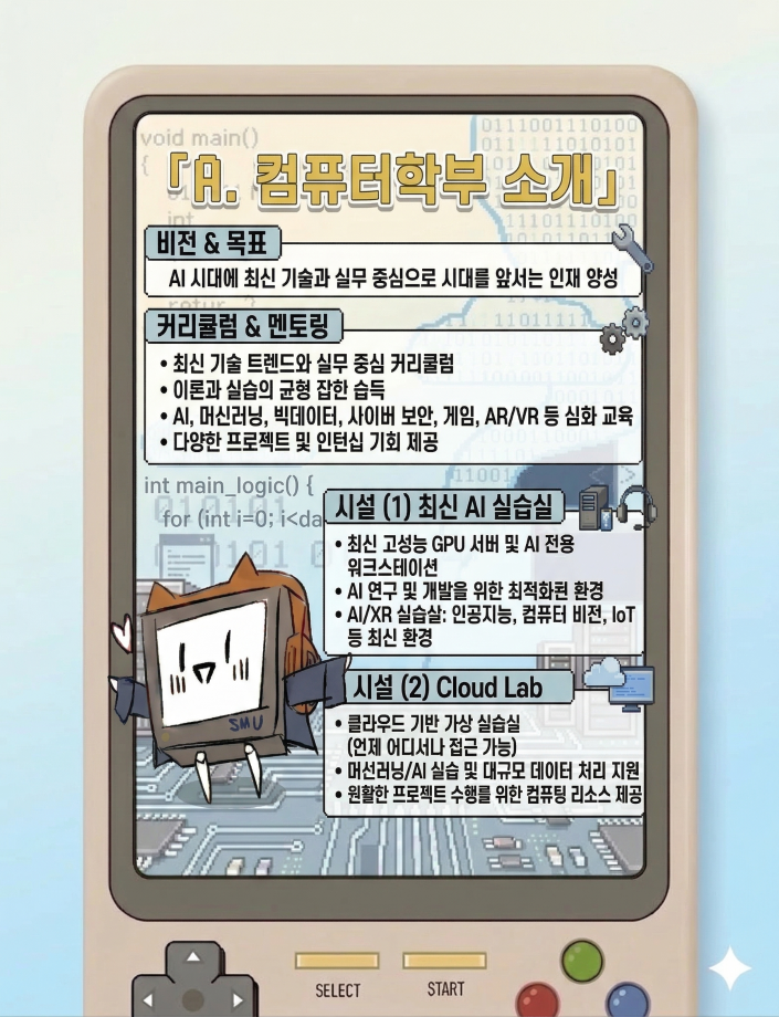 본문 시작 홈으로 학부활동 학부소개 학부활동 교육과정 커뮤니티 학부생활 입학안내 홈페이지가이드 학부갤러리 학부행사 학생회 활동 전공 동아리 학부갤러리 학부갤러리 페이스북 트위터 프린트 2026년 컴퓨터학부 소개 컴퓨터학부 136 2026-03-24 2026학년도 컴퓨터학부를 소개부터 학교 생활에 필요에 대한 가이드까지 안내해드립니다 목록 이전2026학년 신입생 환영회 다음 IT 에서 AI로, "AI융합대학" 으로 바뀌었습니다. 담당부서 : 컴퓨터학부 담당자 : - 연락처 : 043-649-1272 최종수정일 : 2024-10-26 만족도조사 만족도 조사 이 페이지에서 제공하는 정보에 대하여 만족하시나요? 매우만족 만족 보통 불만족 매우불만족