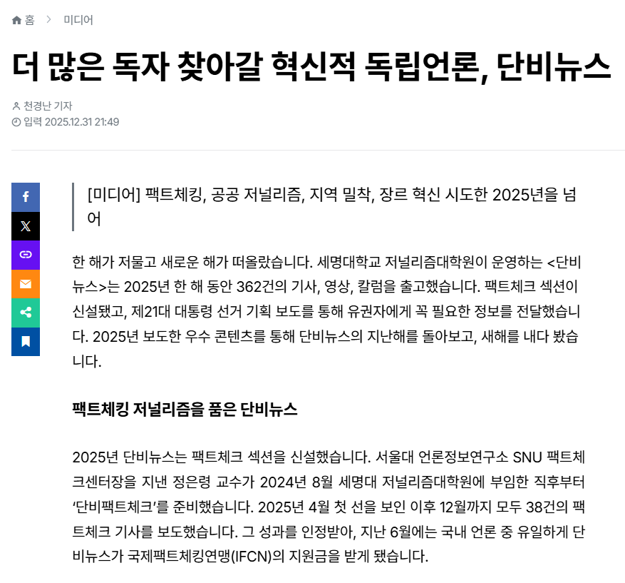 한 해가 저물고 새로운 해가 떠올랐습니다. 세명대학교 저널리즘대학원이 운영하는 <단비뉴스>는 2025년 한 해 동안 362건의 기사, 영상, 칼럼을 출고했습니다. 팩트체크 섹션이 신설됐고, 제21대 대통령 선거 기획 보도를 통해 유권자에게 꼭 필요한 정보를 전달했습니다. 2025년 보도한 우수 콘텐츠를 통해 단비뉴스의 지난해를 돌아보고, 새해를 내다 봤습니다.